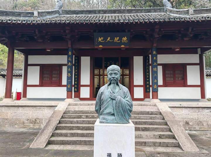 先到位于湘湖越王路北麓的杨时纪念馆,也称“德惠祠”,名由明宪宗皇帝敕赐。比起现在的一些重修建筑,动不动就以气势夺人,豪门华院,巍峨高墙,摆开显赫阵势,纪念馆的山门简朴无华,像杨时生前的为人,不事张扬。馆呈传统的四合院式,院落由石阶连通,依山而上,周边林木森森,花草簇簇,相互掩映,像隐在山里的雅致精舍。院内塑一尊杨时铜像,儒冠长髯,目视前方,神态安详,一副骨格清奇、学问渊博的文人模样。