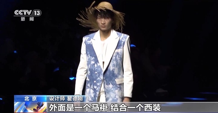 设计师 瞿德刚:外面是一个马褂,结合一个西装。国家级非物质文化遗产自贡扎染,把它运用在我们的服装中,以针代笔,绘制描绘出一只大雁在飞翔的状态。