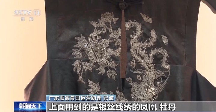 广东顺德莨园运营助理 张波:我们使用的是传统的黑色莨绸,正反异色的,上面有金属般的光泽,上面用到的是银丝线绣的凤凰、牡丹,再加上中式的旗袍领、盘扣和大开袖,设计出符合当下消费者审美的“新中式”服装。