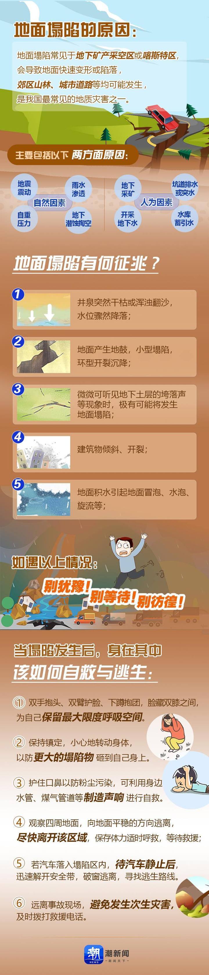 地面塌陷是地表岩、土体在自然或人为因素作用下,向下陷落并在地面形成塌陷坑的一种地质现象。那么,路面塌陷前有哪些征兆?遇到地面塌陷,该如何逃生呢?一图了解: