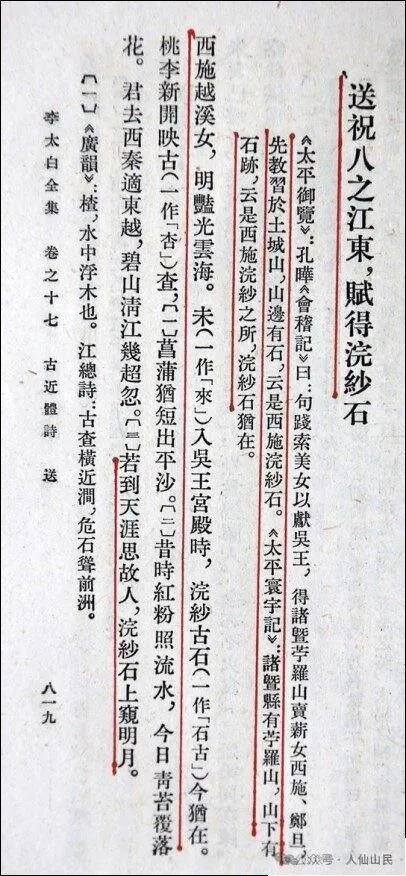 唐·李白《送祝八之江东赋得浣纱石》:“未入吴王宫殿时,浣纱古石今犹存……若到天涯忆故人,浣纱石上窥明月。”