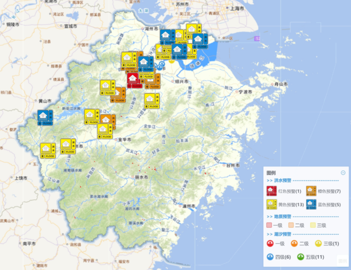 受第二轮强降雨影响,钱塘江、东苕溪和杭嘉湖东部平原洪水同时暴发,共有35条河流46个站点水位超警超保。