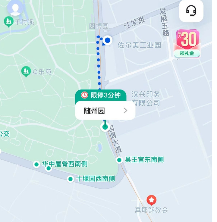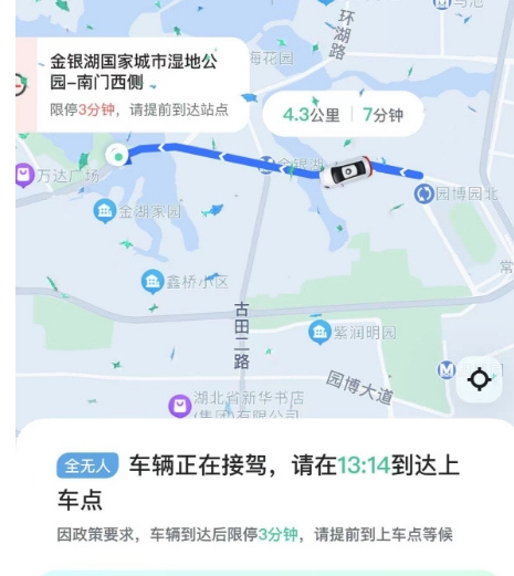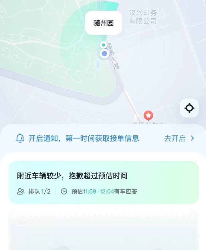 7月15日上午11时30分,记者在“萝卜快跑”app中定位至硚口区园博园东侧,输入前往“汉江江滩东侧”目的地,并据其地图指引步行至指定上车点“随州园”。