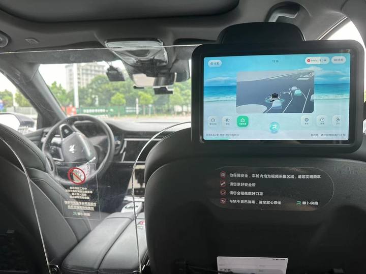 这辆“萝卜”车型是北汽极狐的一款SUV,车内整洁宽敞无异味,空调打得很足,暑气顿消。副驾驶粘贴着“禁止前排入座”的提示,3块屏幕环顾驾驶位。前排座椅后面贴着两块触摸屏,除了具备空调温度、屏幕亮度、行驶场景显示等常规功能外,还有一些视频、音乐浅娱乐功能供后排乘客消遣。