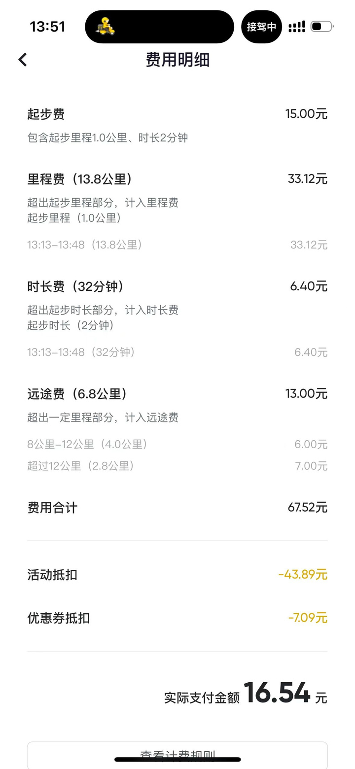 13时48分,记者结束本次体验,行程共计13.8公里,时长32分钟,实际支付金额扣除优惠券及超时补偿券后为16.54元。看起来,“萝卜”的价格的确有着不小的竞争力。不过,有业内人士表示,萝卜快跑在武汉如此低价,还是依靠补贴为主,优惠前价格与市场定价差距不大。