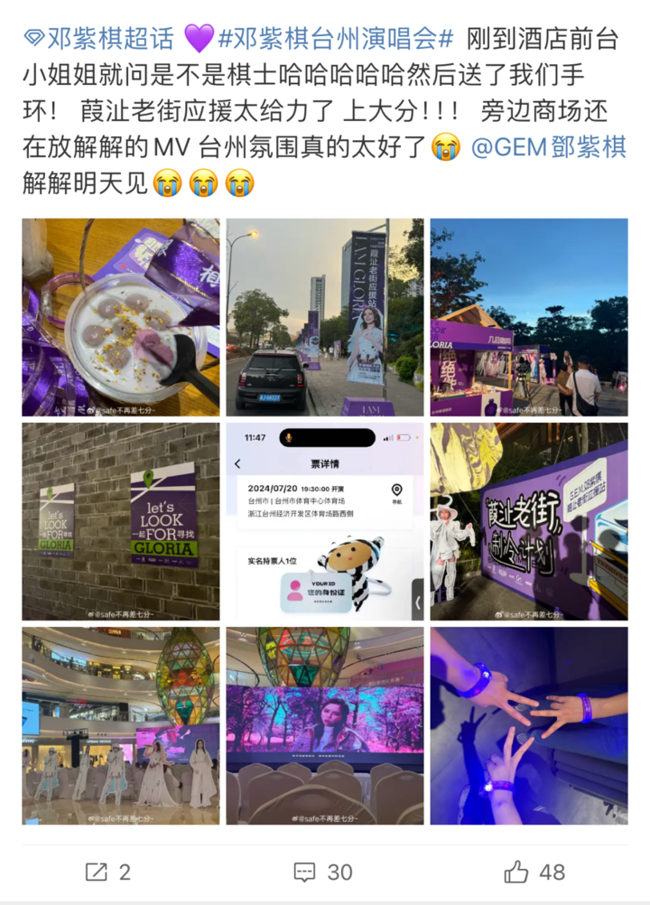 7月19日-21日,“邓紫棋台州葭沚老街应援”刷屏各大社交网站,在微博超话、抖音直播、朋友圈等抖音tag热度达565.5万。