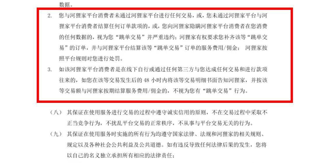 记者注意到,在河狸家《服务协议》中,“跳单交易”订单如何处理有相关说明:“跳单”情况出现后,手艺人需补齐 “跳单交易”的订单服务费以及佣金,如48小时内将该等交易明细书面告知河狸家,并完成相关结算,不视为有“跳单交易”行为。