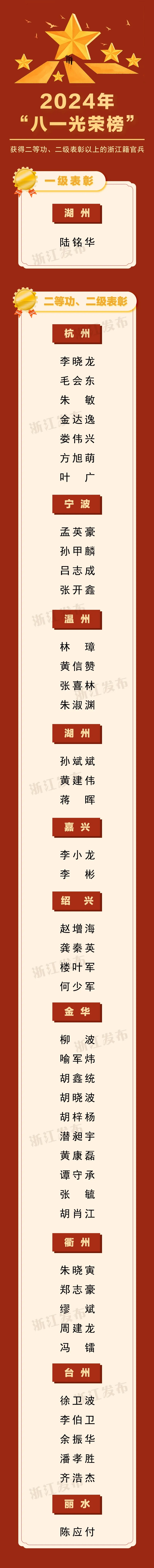 他们是荣登2024年“八一光荣榜”的浙江籍官兵。之所以上榜,是因为他们在2023年4月1日至2024年3月31日期间,曾获得二等功、二级表彰以上。