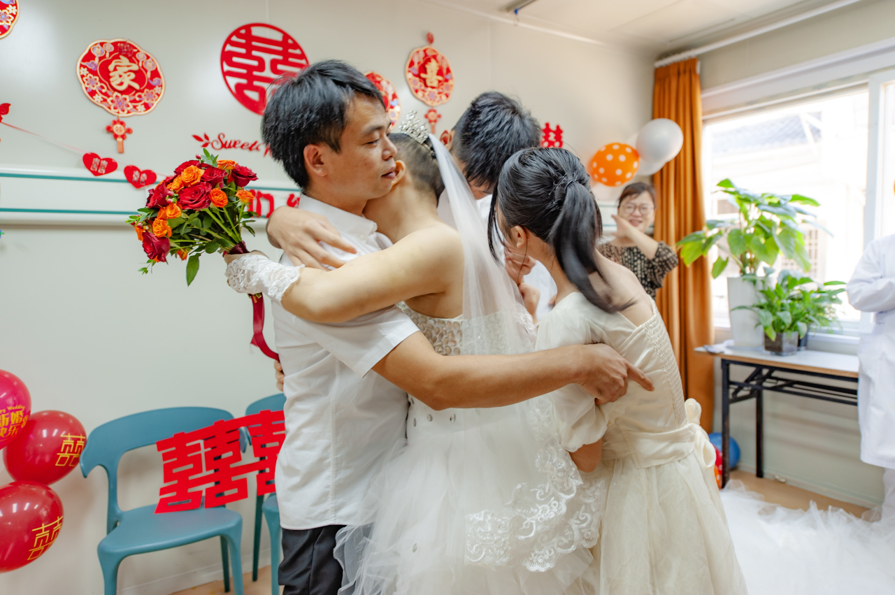 信息科的朱海波负责拍照,体检中心的主任沈益梅负责拍视频,志愿者团队提前准备好新娘捧花,并负责后续的相册制作……现场,还有不少医务人员自发参与,为这场婚礼提供服务。大伙儿的关爱和帮助,令夫妻俩心怀感激。