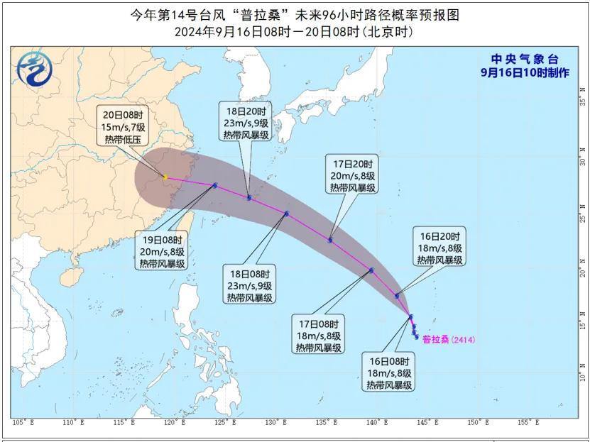 第14号台风“普拉桑”(强热带风暴级),今天14时位于舟山东偏南方向约210公里,即北纬29.4度,东经124.3度,中心气压985百帕,近中心最大风力10级,以30-35公里的时速朝西偏北方向快速移动,最大可能于今天傍晚到上半夜穿过或登陆舟山后西北行。