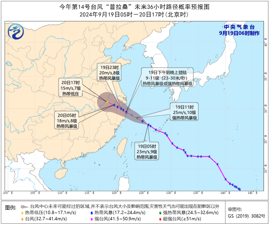 预计,“普拉桑”将以每小时35-40公里的速度向西偏北方向快速移动,强度还将有所增强,并将于19日下午到晚上在浙江温岭到舟山一带沿海登陆(热带风暴级或强热带风暴级,9-11级,23-30米/秒),之后强度逐渐减弱。
