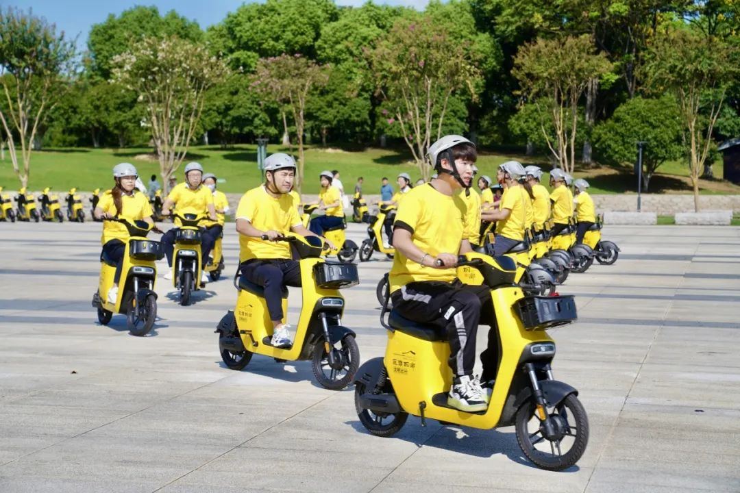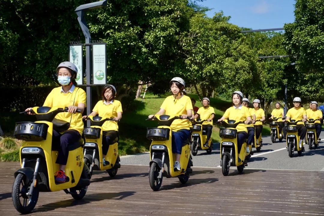 凤凰湖畔,一抹鲜亮的黄色点缀于绿树碧水间,格外引人注目。细看之下,原来是一群骑行体验官组成的“车队”,他们正试驾着最新款的共享电单车。