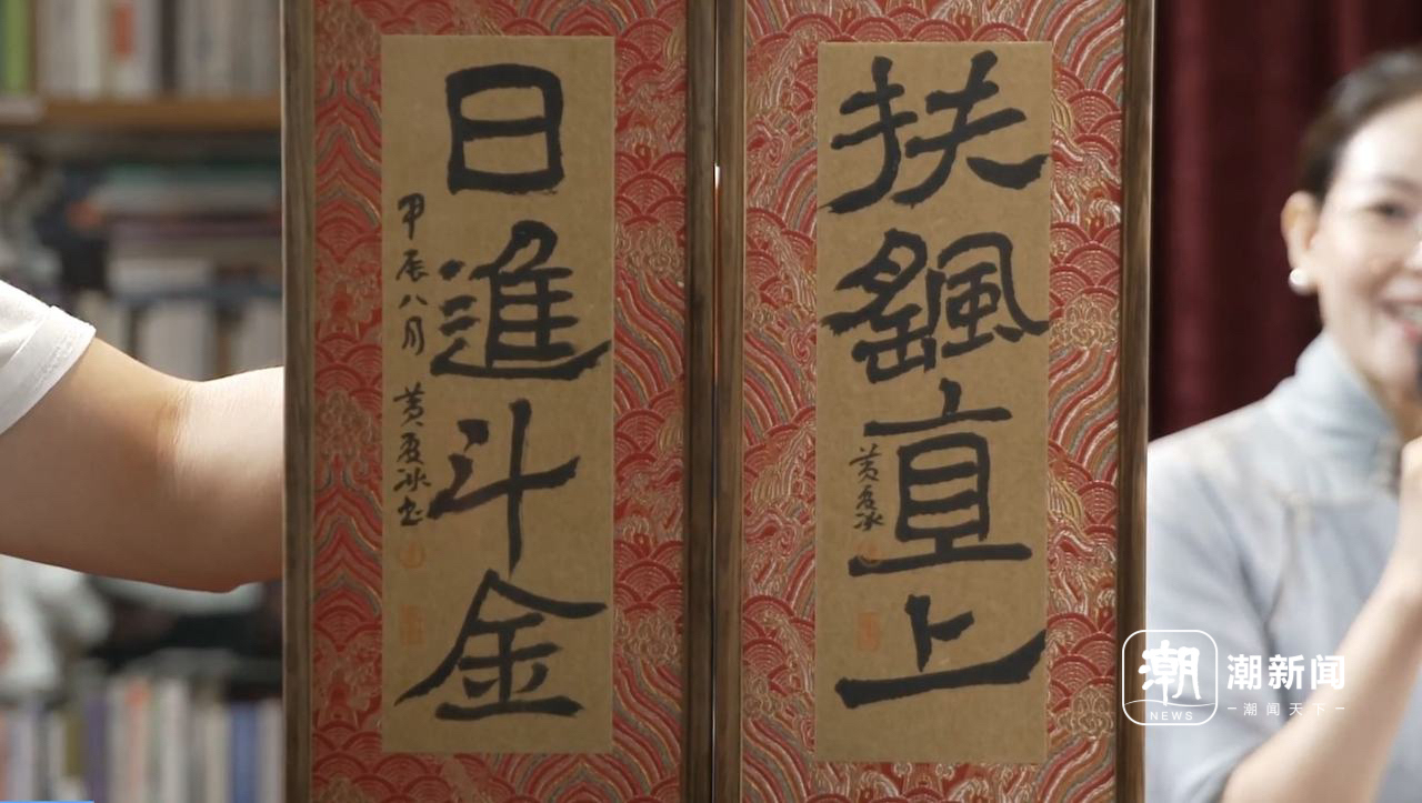 乾嘉书房创始人、浙江省书法家协会理事、杭州女书法家协会副主席黄夏冰捐出了两幅书法作品《日进斗金》和《扶摇直上》。黄夏冰说,大概20年前她就拜访过“纯真年代”书吧,被朱锦绣和盛子潮的爱情故事深深感动,“当时我还是个小姑娘,朱老师大概没什么印象,后来我开了乾嘉书房,又见了朱老师,从她那里获得了很多人生启迪,非常感谢她。今天我带来自己的两件小品,一件是《日进斗金》,表达我对书吧和在座以及线上朋友最朴素的祝福;另一件是《扶摇直上》,借用庄子《逍遥游》的典故,希望‘纯真年代’书吧能够大鹏展翅,乘风而起。衷心祝愿‘纯真年代’书吧能够越来越好,也希望它能够续写杭城文化事业的新篇章。”