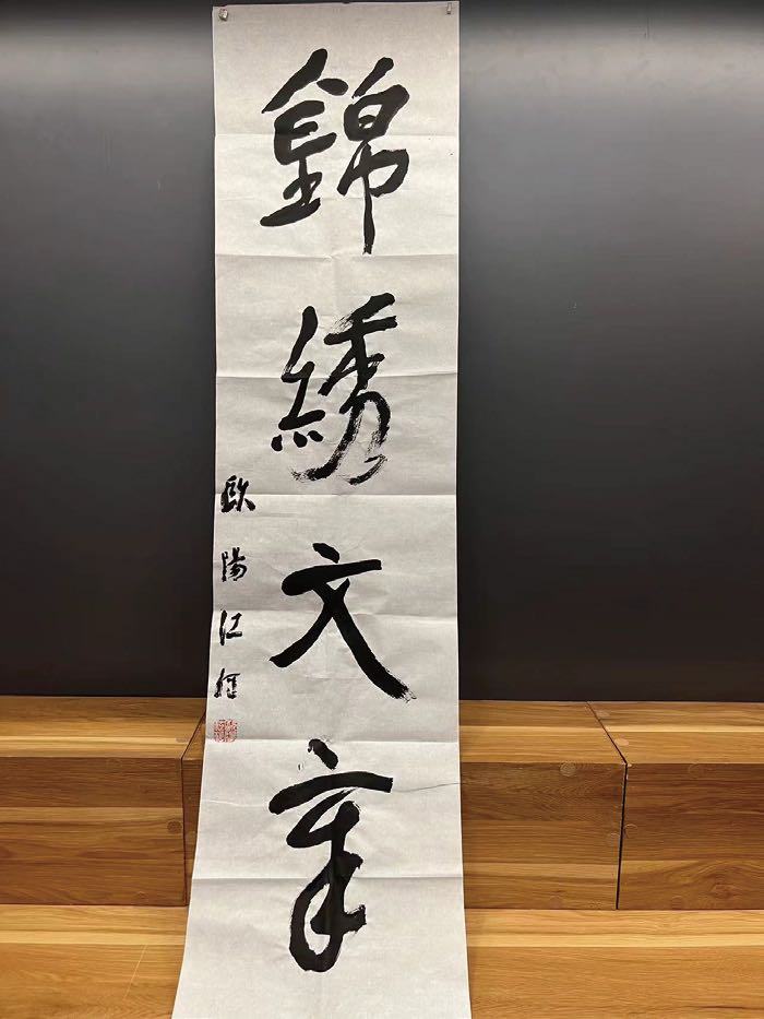 北师大教授、诗人欧阳江河也捐出了自己的书法作品《锦绣文章》。“欧阳江河的书法作品在诗人中非常有名,这次‘结缘之夜’,我们向他求来这幅字,他非常支持。”朱锦绣说,能与这些作家朋友结缘,是书吧的幸运和福气,感谢大家对书吧的宠爱和支持。