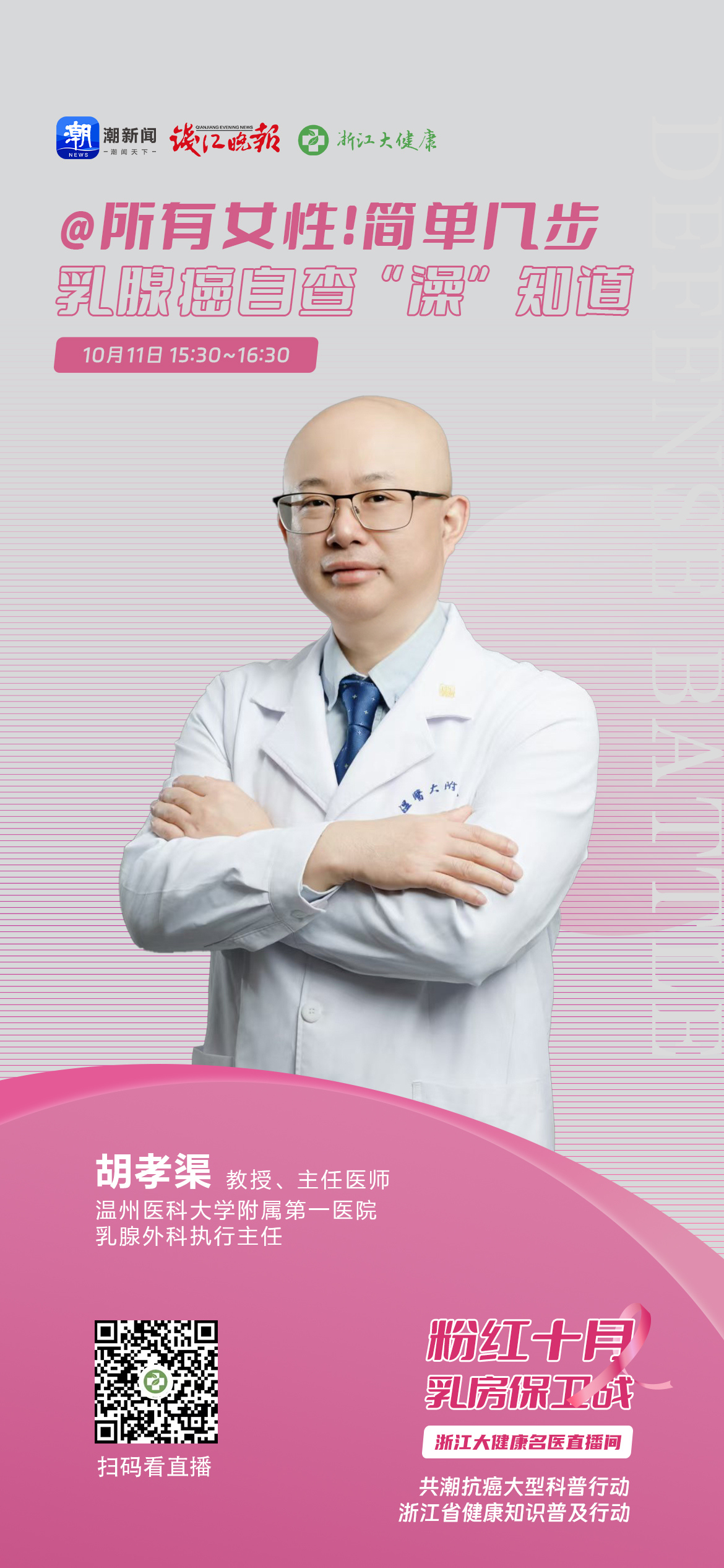 那么,常见的乳腺增生、乳腺结节,距离乳腺癌有多远?进行自查、早筛时有哪些关键点要注意?如何呵护我们的乳房健康?十月是世界乳腺癌防治月,又称“粉红丝带月”,潮新闻·钱江晚报特别推出“粉红十月乳房保卫战”系列直播。10月11日15:30—16:30,温州医科大学附属第一医院乳腺外科执行主任、主任医师,胡孝渠教授,将走进浙江大健康视频号名医直播间,带来《@所有女性!简单几步,乳腺癌自查“澡”知道》主题科普。