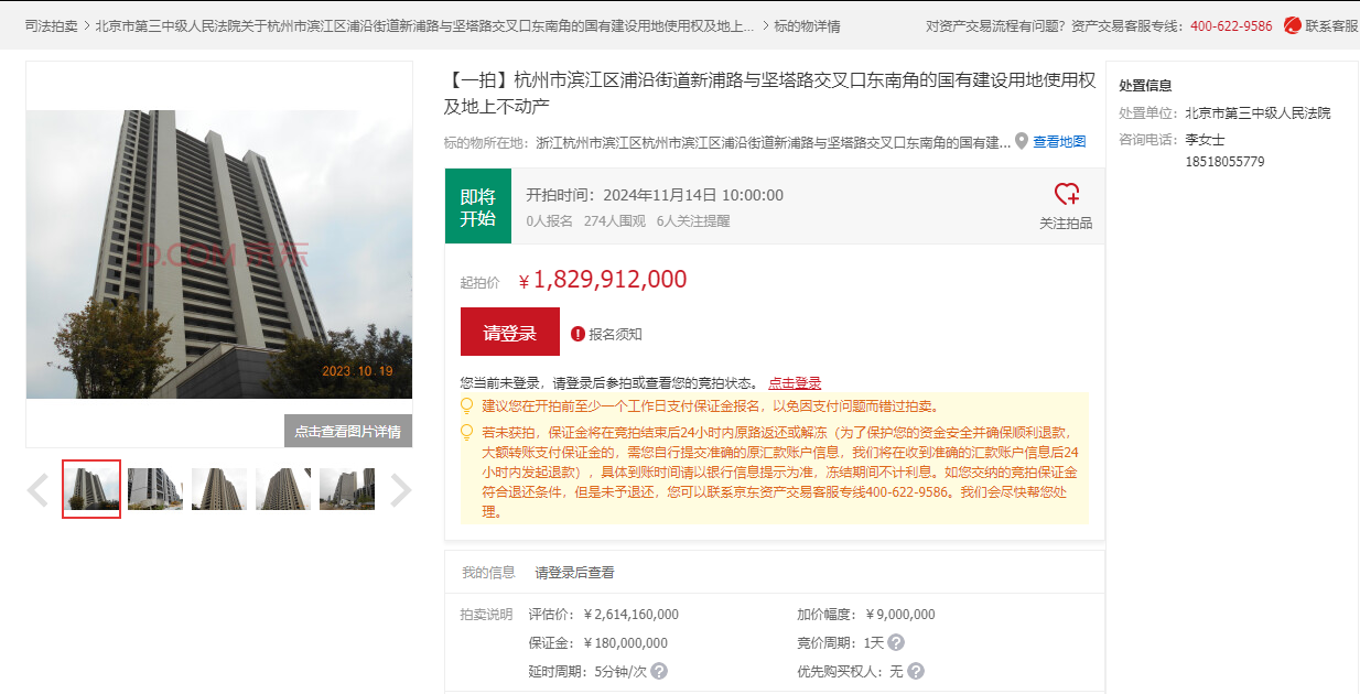限价取消后,主城区“鸽盘”世茂栖棠誉湾10月14日迅速被搬上法拍平台,土地使用权连带地上不动产打包拍卖,一拍评估价约26.14亿元,起拍价约18.3亿元。