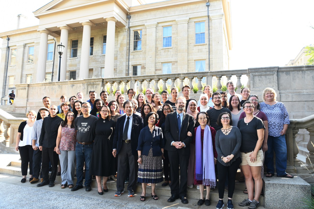2018年9月17日,聂华苓(前排右三)和“国际写作计划”项目参与者合影,蔡天新也是成员之一(前排左五) 新华社图片