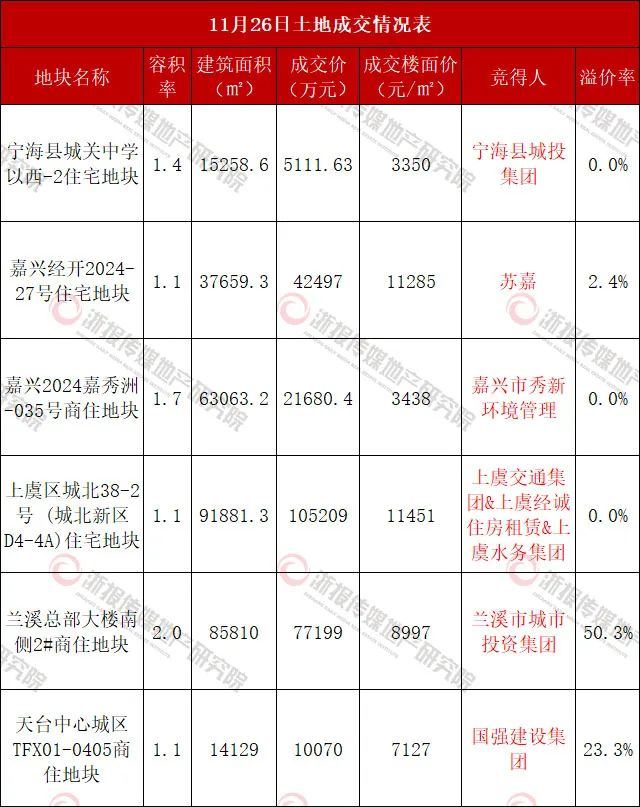 今日,宁波宁海县、嘉兴秀洲区、嘉兴南湖区、绍兴上虞市、金华兰溪市和台州天台县共计6宗地块出让。