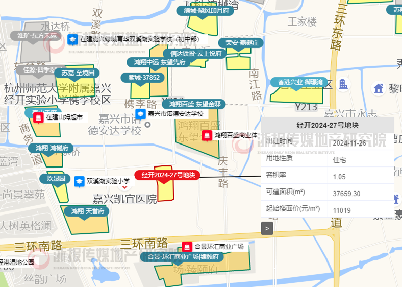 经开2024-27号地块用地面积35866㎡,容积率1.05,建筑面积37659.3㎡。最终经过11轮报价,由苏嘉以42497万元总价竞得,楼面价11284.69元/㎡,溢价率2.4%。