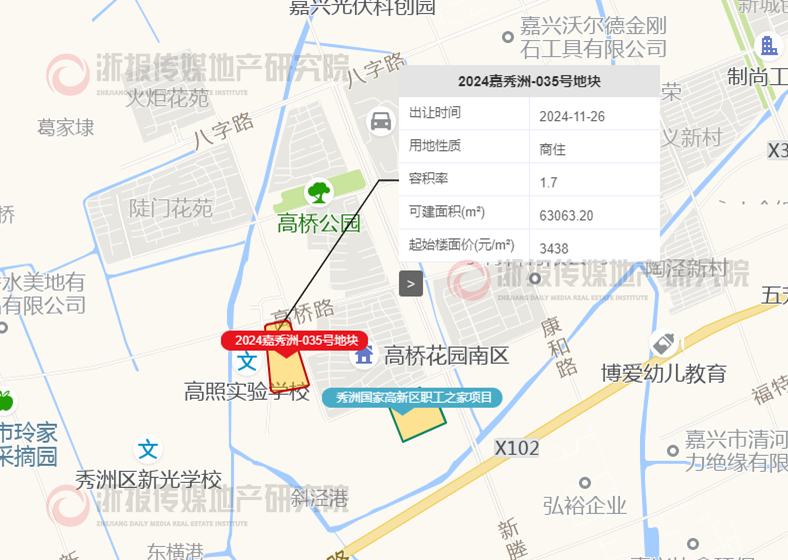 2024嘉秀洲-035号地块用地面积37096㎡,容积率1.7,建筑面积63063.2㎡。最终经过1轮报价,由嘉兴市秀新环境管理以21680.38万元底价竞得,楼面价3437.89元/㎡。