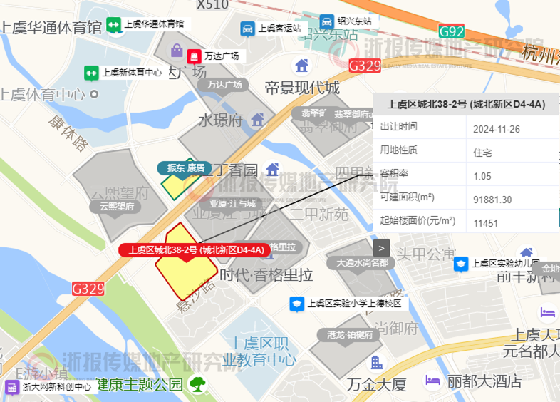上虞区城北38-2号 (城北新区D4-4A)用地面积87506㎡,容积率1.05,建筑面积91881.3㎡。最终经过1轮报价,由绍兴市上虞区交通集团%绍兴市上虞经诚住房租赁有&绍兴市上虞区水务集团以105209万元底价竞得,楼面价11450.57元/㎡。