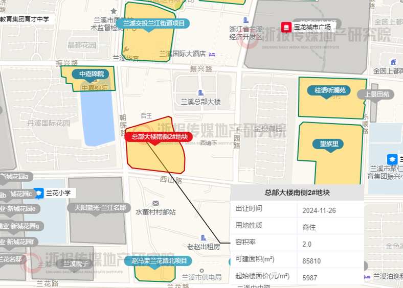 总部大楼南侧2#地块用地面积42905㎡,容积率2.0,建筑面积85810㎡。最终经过120轮报价,由兰溪市溪西商圈开发建设以77198.9665万元总价竞得,楼面价8996.5元/㎡,溢价率50.3%。