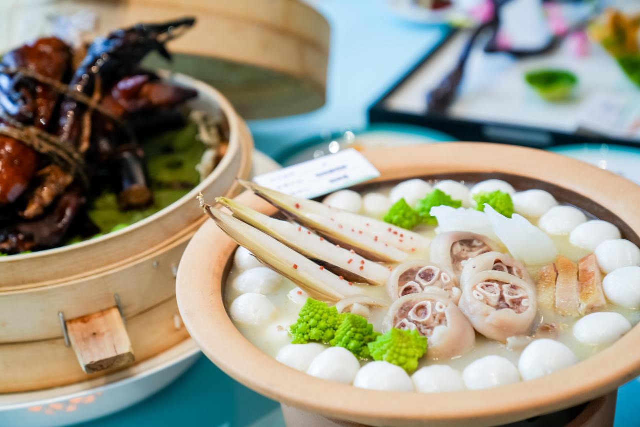 展台赛以企业为单位,通过6道围碟和1道创意总盆,6道热菜与4道点心组合呈现,同步进行现场讲解。味庄把宋韵和青绿山水融入到摆盘和餐饮氛围之中,清新典雅,展示了杭帮菜的韵味,获得了第一名。