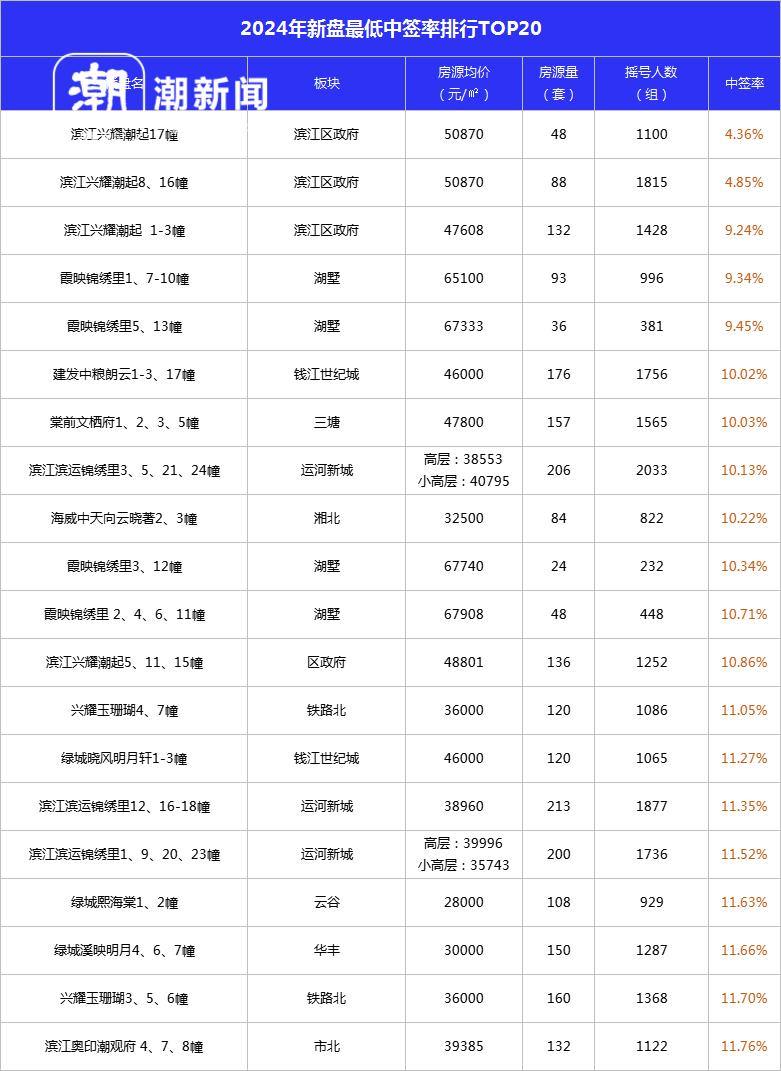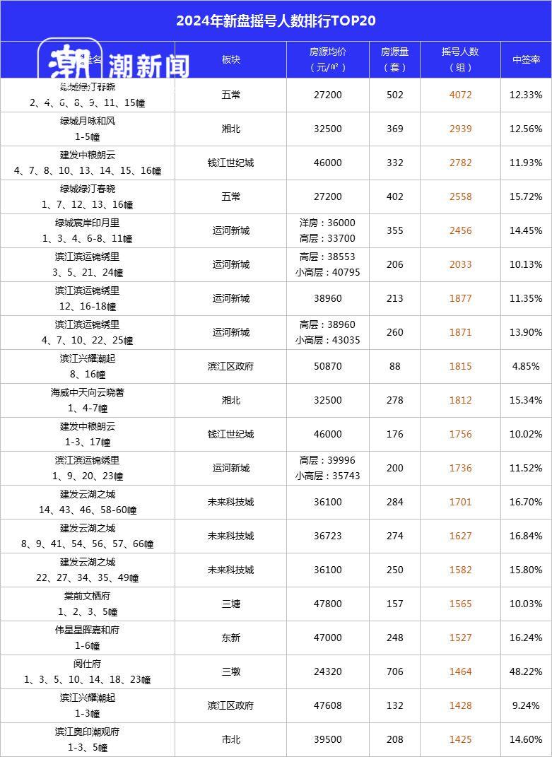 另一方面,除了主城市区改善楼盘,以及萧山奥体、市北等热门板块新盘仍然保持较高热度,越来越多板块的新盘开盘流摇已经成为常态。数据显示,2024年全年新建商品住宅楼盘开盘近500次,流摇次数占比65%。