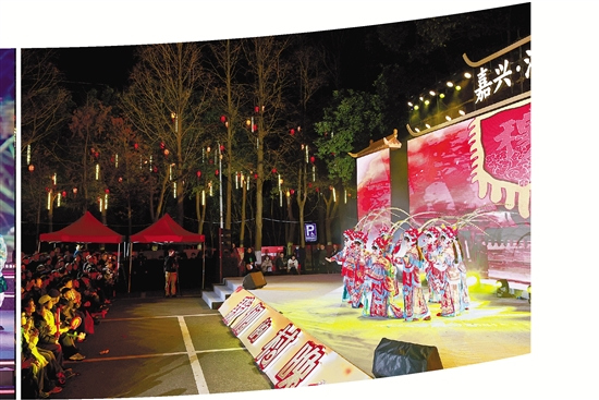 场内,一出出精彩表演,引来观众阵阵掌声、笑声。场外,夜晚的桃园村,处处张灯结彩,热闹喜庆。
