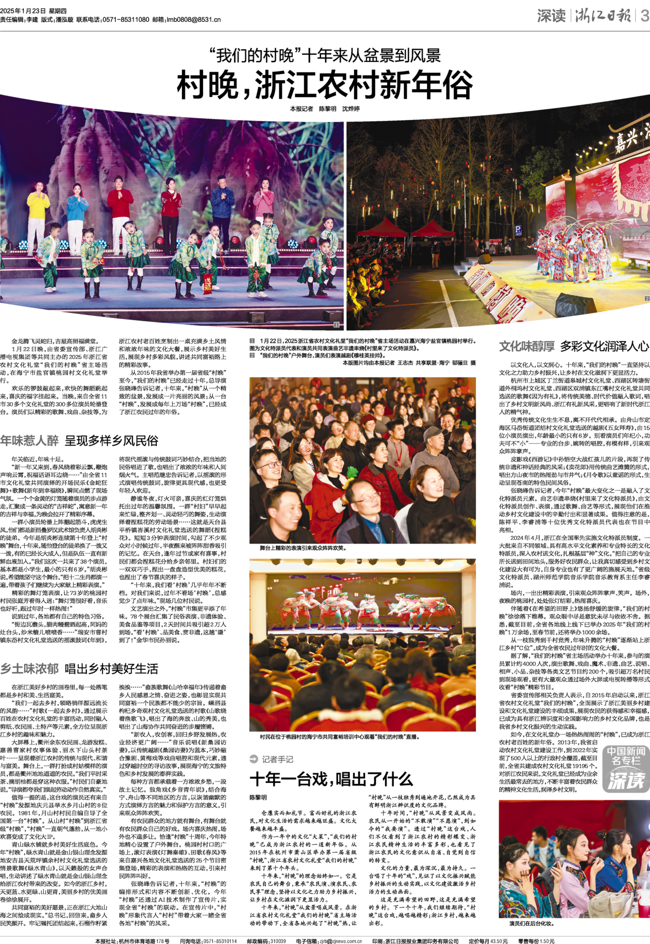 1月23日,《浙江日报》深读版刊发《“我们的村晚”十年来从盆景到风景 村晚,浙江农村新年俗》一文。