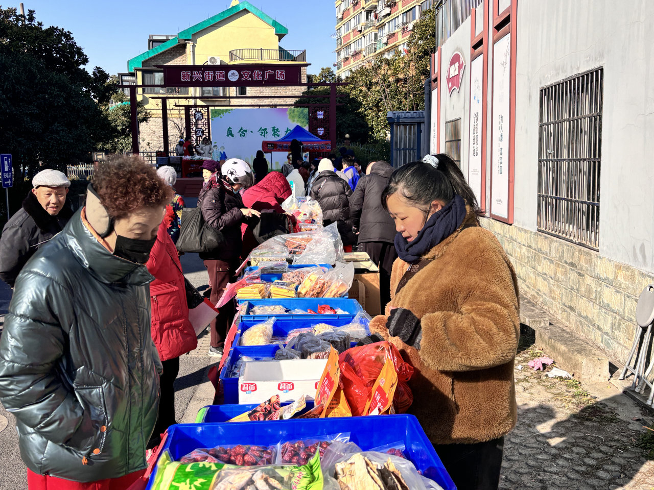 年货节现场,炸货、牛奶、矿泉水等传统年货琴瑞满目,让人目不足掩。盒马鲜生的加入更是让居民们能够轻松购得新鲜海鲜与果蔬,为年夜饭桌增添更多美味选择。小型商超便民摊掰提供一站式购物体验,方便快捷。