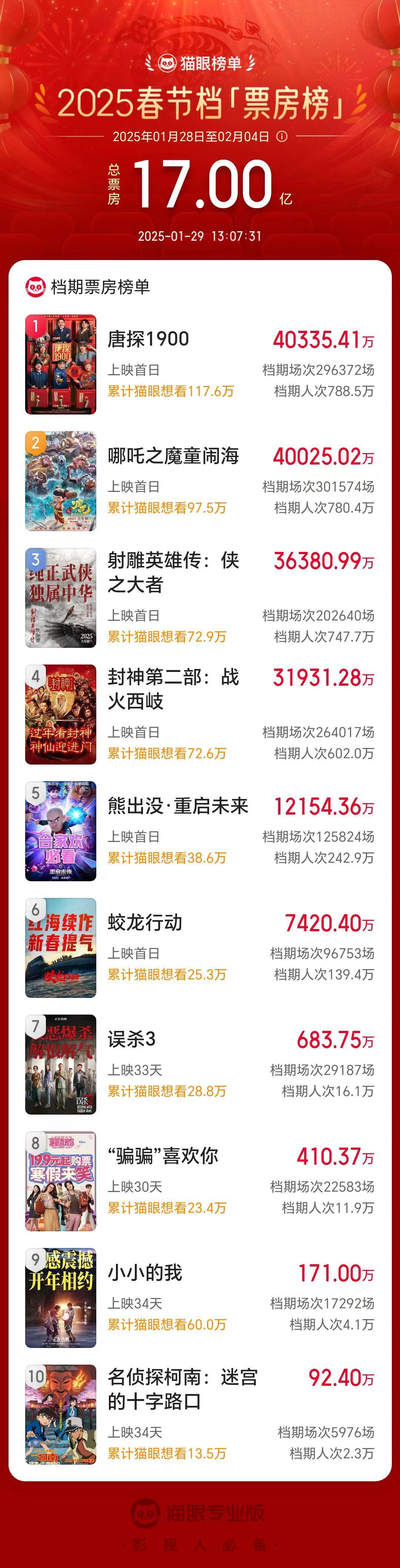 据猫眼专业版数据,1月29日13时07分2025春节档总票房(含预售)破17亿!《唐探1900》《哪吒之魔童闹海》《射雕英雄传:侠之大者》分列春节档票房榜前三位。