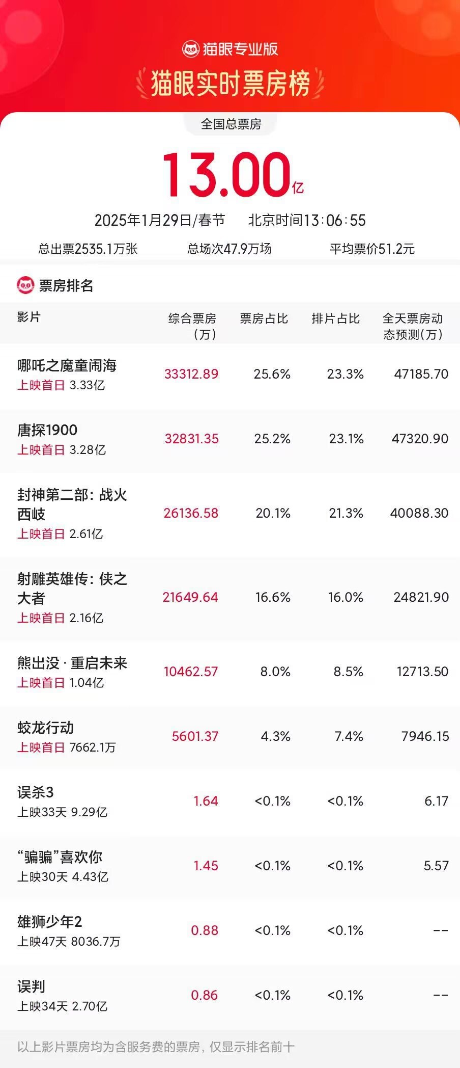 截至1月29日13时06分,2025年大年初一总票房破13亿,《哪吒之魔童闹海》《唐探1900》《封神第二部:战火西岐》分列大年初一票房榜前三位。