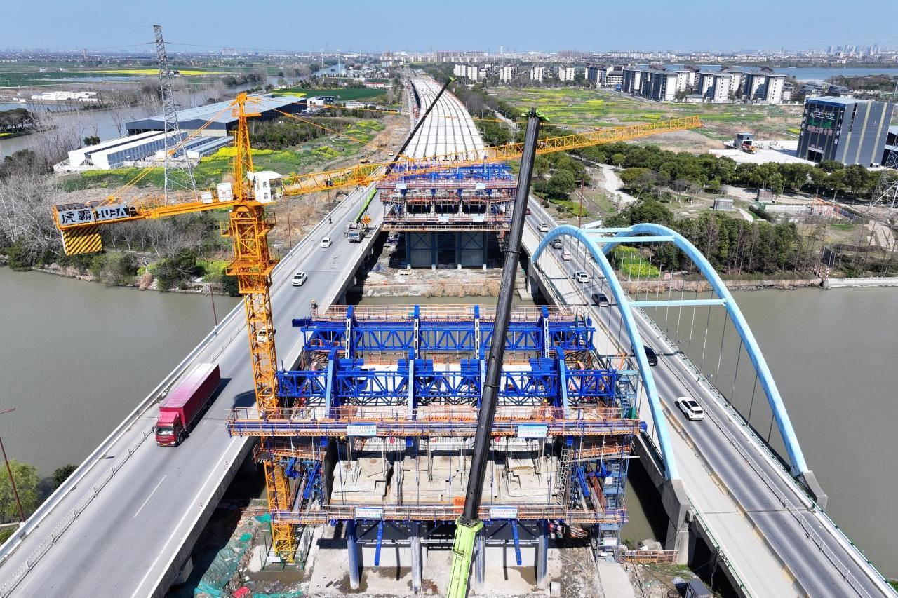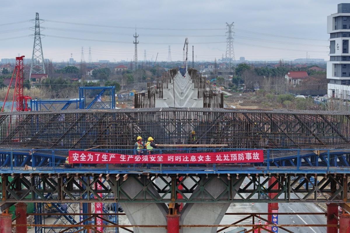 走进嘉兴市域快速路城东路(嘉善)射线施工现场,放眼望去,只见梁板凌空飞架,施工人员正在攻克项目关键控制性节点——跨乍嘉苏航道段挂篮施工,空中蓝色的桁架式挂篮不断向前推进,底下航道内船只来来往往,一派繁忙的景象。