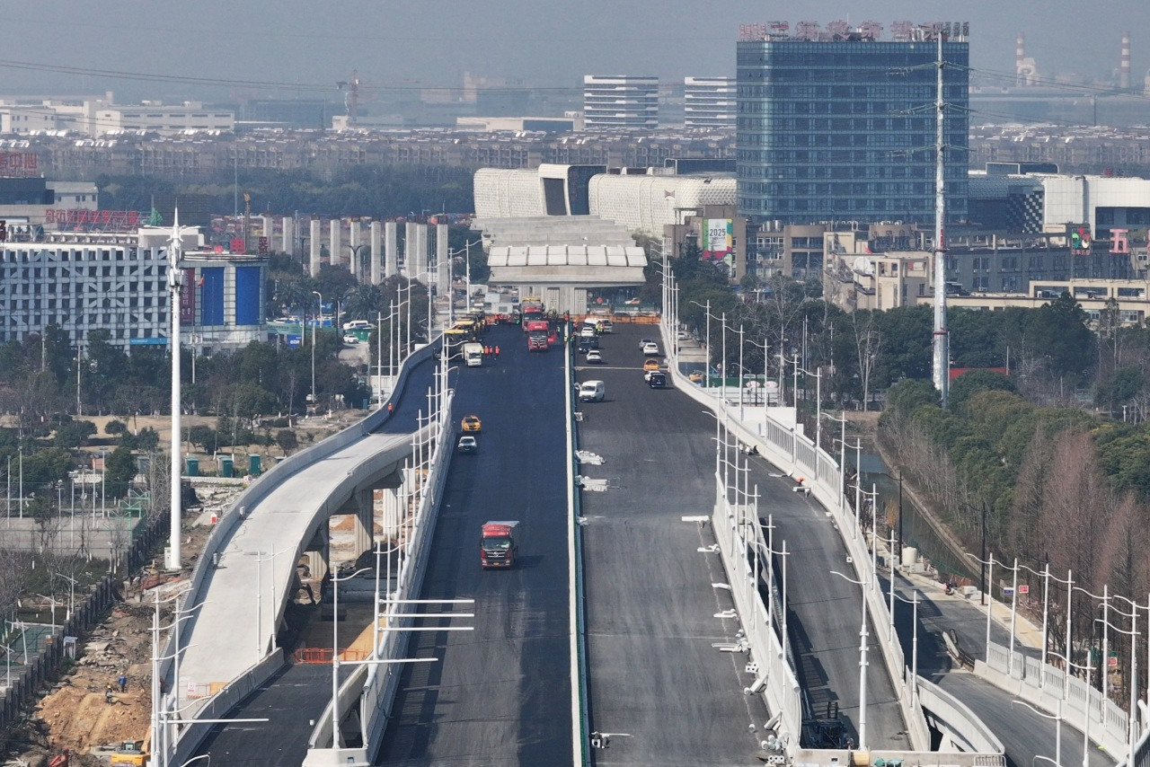 目前,桥梁工程方面下部结构已经全部完成,预制箱梁和钢箱梁的架设也全部完成,桥面铺装和桥面护栏在大面积施工,今年1月份茶园路到鸣羊路地面道路开放以来,在抓紧进行鸣羊路以东的路基路面施工,机电、交安、绿化也在同步进行施工。