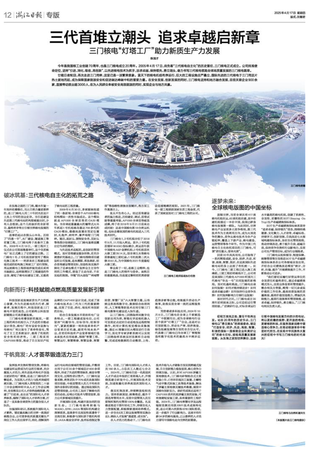今年是我国核工业创建70周年,也是三门核电成立20周年。2005年4月17日,肩负着“三代核电自主化”的历史重任,三门核电正式成立。公司找准使命定位,坚持“引进、消化、吸收、再创新”,以先进核电技术为抓手,追求卓越、保持领先、勇立潮头,奋力书写三代核电领跑全球高质量发展的三门核电篇章。
