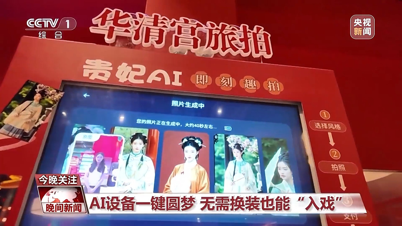 还有很多游客可能因为行程安排紧张,错过了旅拍体验。但如今不少景区在科技的助力下,也可以让游客不再留下遗憾。穿汉服打卡“长安”,已成为许多游客来西安旅行的目的之一。在华清宫景区,新上线的“贵妃AI”智能设备让游客无需换装,就能通过人工智能技术生成多种风格的写真,轻松实现“汉服梦”。