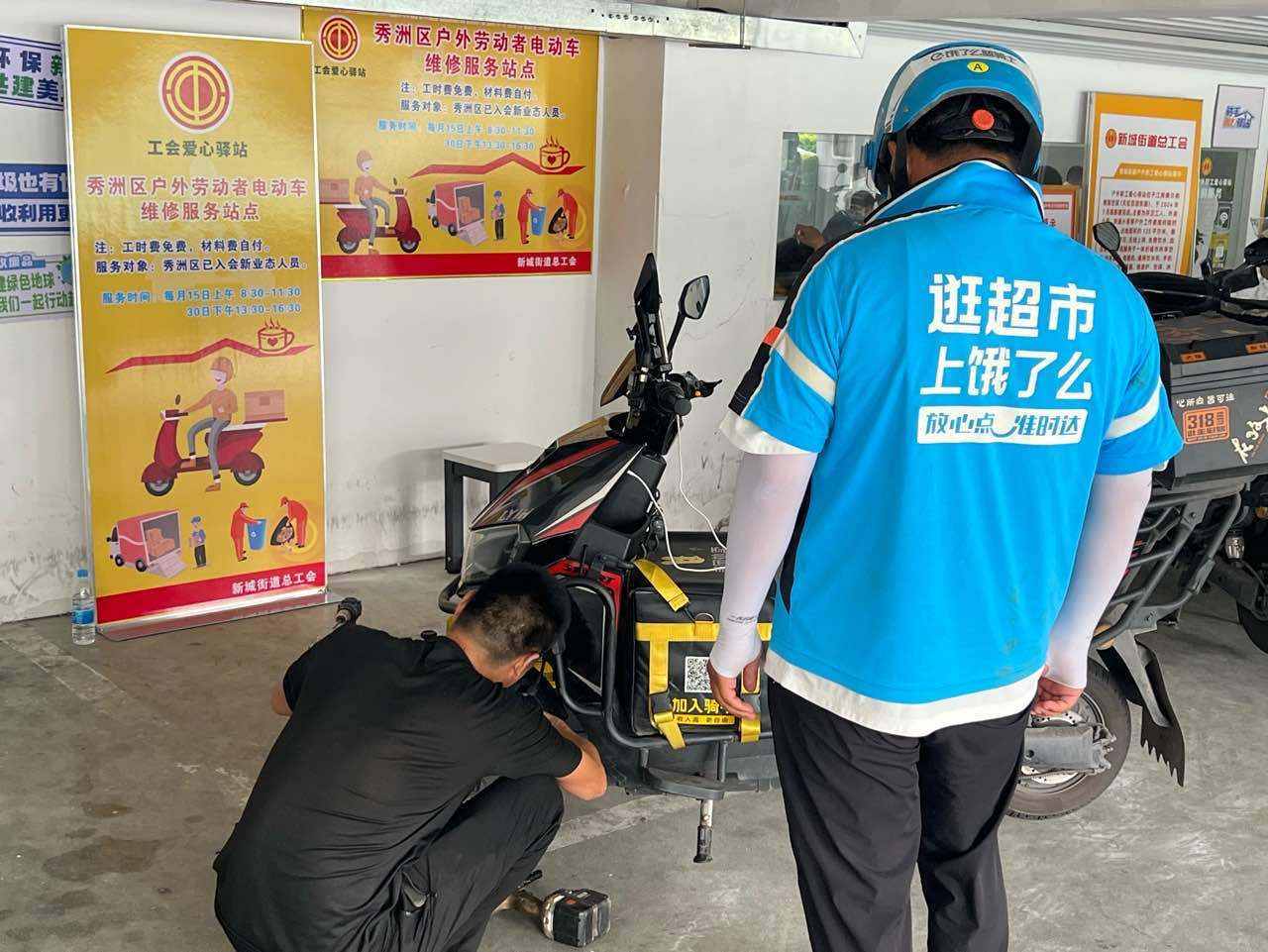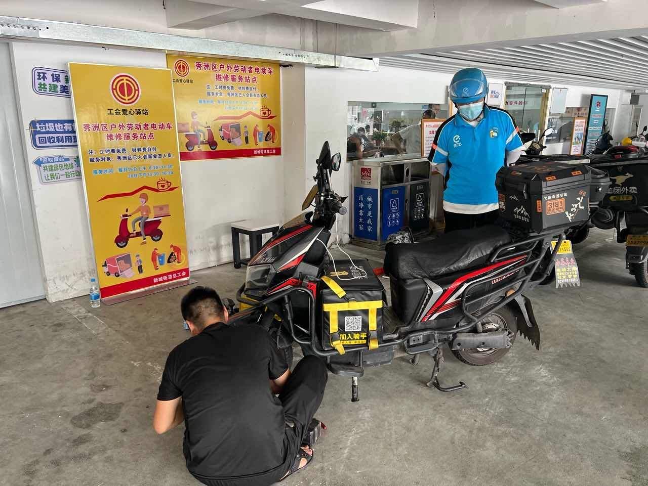 户外劳动者们每日穿梭于大街小巷,电动车是他们工作中不可或缺的伙伴。然而,电动车故障问题时常困扰着他们,维修不便更是让人头疼。为切实解决这一难题,让户外劳动者感受到更多关怀与便利,秀洲区新城街道总工会在江南摩尔爱心驿站设立了电动车维修服务站点,为他们的出行安全“保驾护航”。