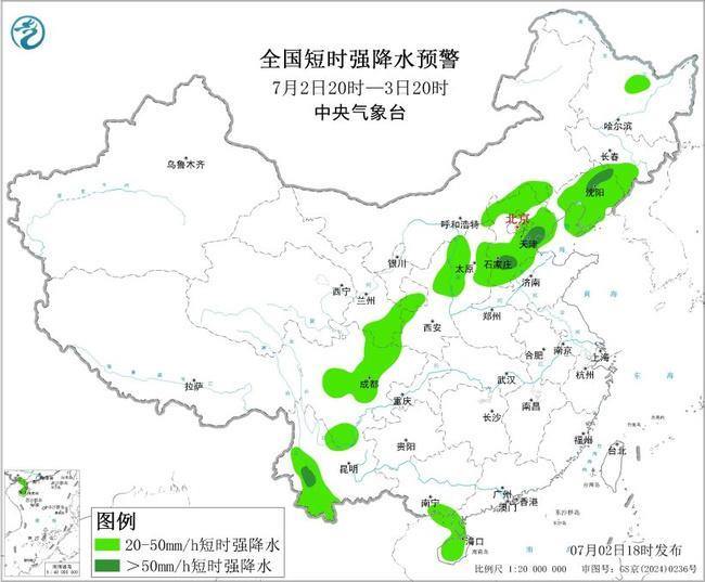 预计7月2日20时至3日20时,东北地区中南部、华北中南部等地的部分地区将有8级以上雷暴大风或冰雹天气,其中,辽宁中部、河北东北部等地的部分地区将有10级以上雷暴大风,最大风力可达11级以上;东北地区南部、华北、西北地区东部、西南地区西南部、华南等地的部分地区将有小时雨量大于20毫米的短时强降水天气,其中,辽宁中北部、河北中南部、天津、云南西南部等地的部分地区小时雨量大于50毫米,最大可达70毫米以上。