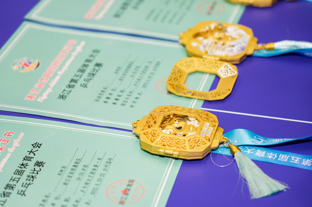 浙江省第五届体育大会奖牌,中间有“台”字形象。