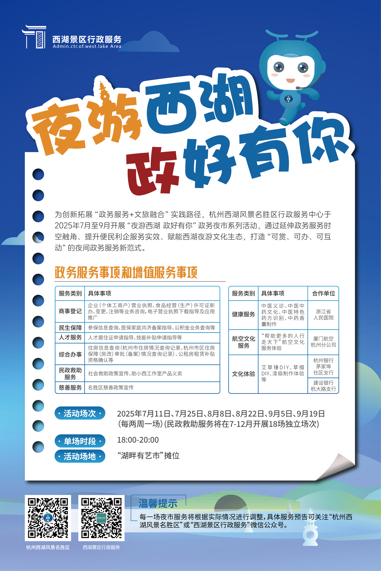 去年,西湖景区率先推出“非工作时间”预约制增值服务,解决了部分“上班没空办”问题。今年,景区创新打造“政务夜市+非工作时间预约制”双轨服务模式,将服务延伸至市民熟悉的西湖水域管理处湖滨景区“湖畔有艺市”,打破传统政务服务在时间与空间上的双重限制,让您逛着街、散着步,就把事儿办成。