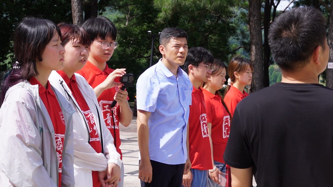 傅迪华还为队员们讲述了陵园的历史背景和安葬英烈的感人事迹,深入解读了革命精神的内涵。“这里的每一笔都是对先烈的赤诚敬仰呀!”面向郭沫若题写的鎏金大字“革命烈士永垂不朽”,他动情地和大学生们说。
