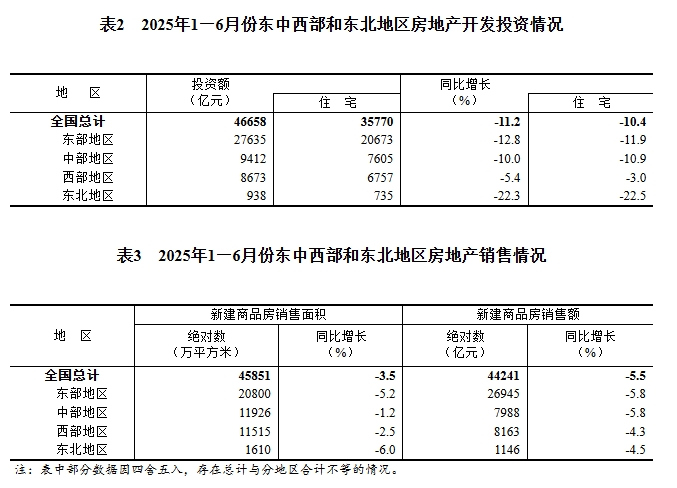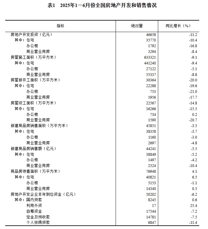 刚刚,国家统计局公布2025年上半年全国房地产市场基本情况。数据显示,1—6月份,全国房地产开发投资46658亿元,同比下降11.2%;其中,住宅投资35770亿元,下降10.4%。