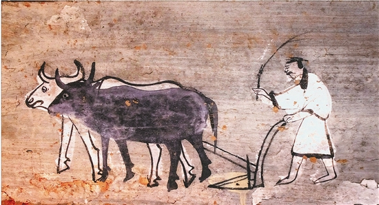 东汉时期壁画《牛耕图》,一农夫身穿白色长袍,赤脚,左手扶犁,右手执鞭,黑、白二牛牵犁而耕。