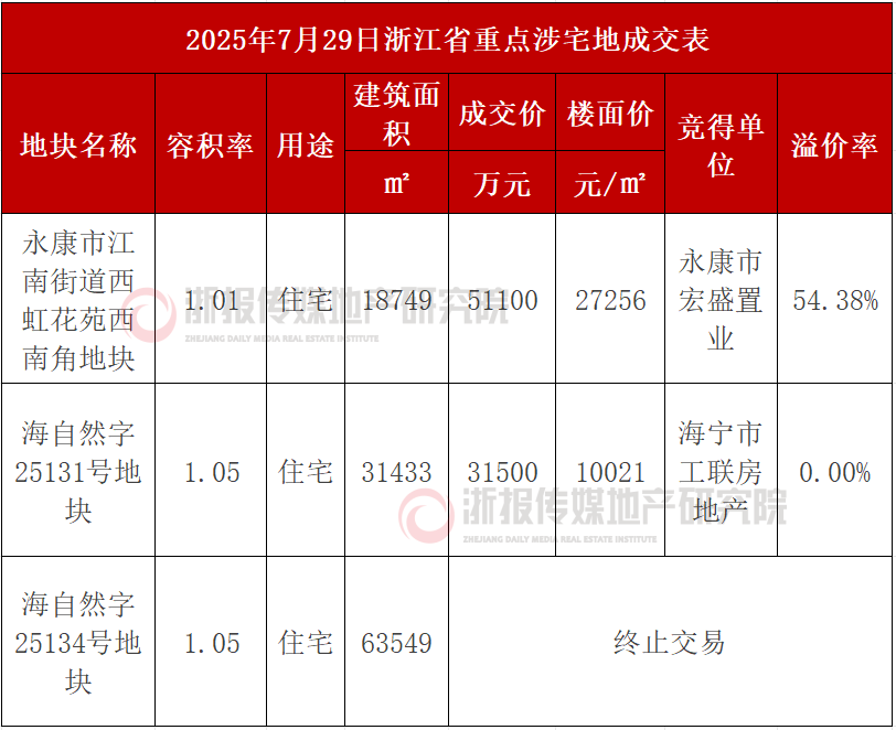 今日,金华永康、嘉兴海宁各一宗涉宅地出让成交,另有一宗本预计今日出让的海宁皮革城宅地终止出让。