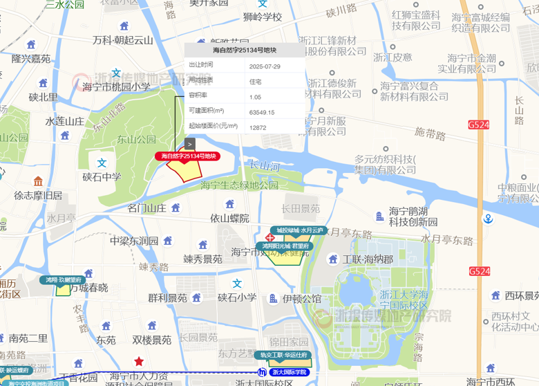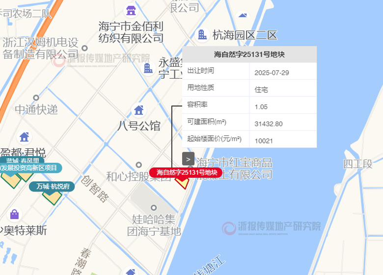 地块最终由海宁市工联房地产开发以31500万元总价底价竞得,楼面价10021元/㎡。板块近年出地较少,且基本没有低密项目,近年出让成交的海宁城市发展投资项目2022年12月成交楼面价9274元/㎡(容积率2.2)。