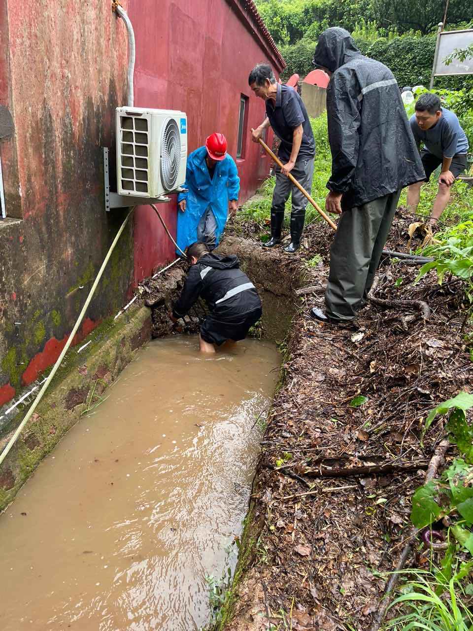 7月30日上午,受台风"竹节草"带来的强降水影响,金塘镇山潭村广德庙后方水沟出现积水,对周边农田造成影响。村巡查员在防汛巡查中发现该情况后立即上报,山潭村包村干部迅速组织力量赶赴现场开展清淤疏通工作,及时消除隐患。(金塘管委会)