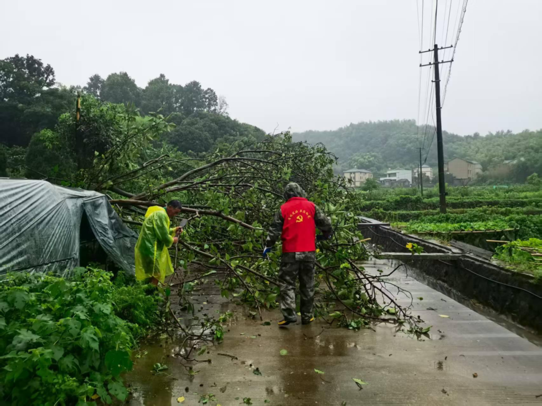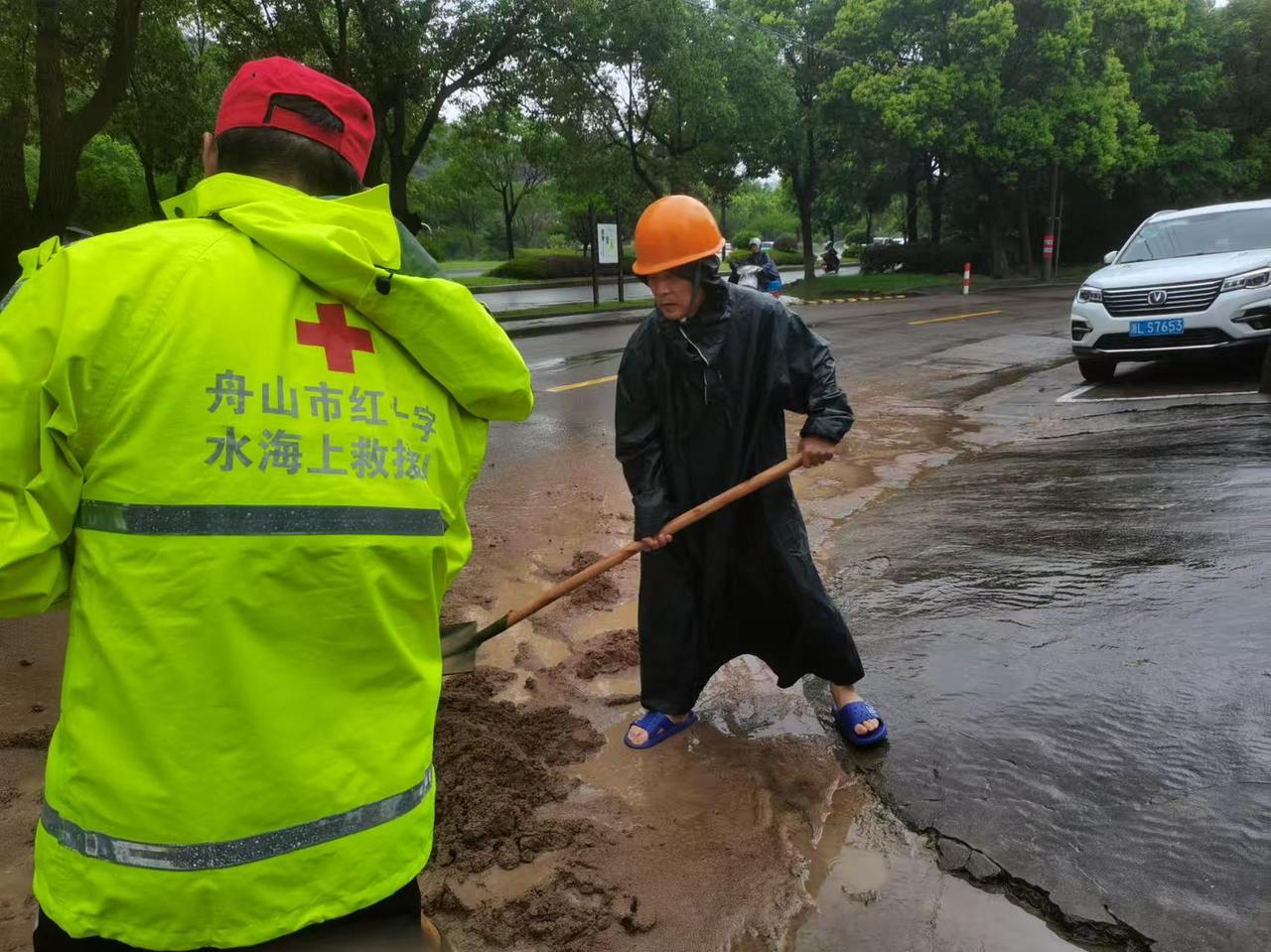 7月30日上午,定海区大洋岙玉兰桥路段积水退去后路面泥沙淤积,村干部带领村干部和红十字水上救援队工作人员清理泥沙。(定海区委宣传部)