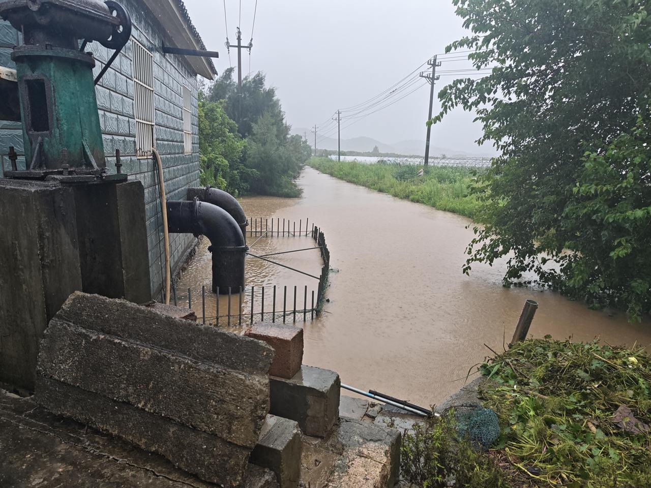 7月30日上午,因台风带来较大雨量,朱家尖街道河水水位上涨,多处农田受淹,街道实时开闸放水,并通过翻水站等水利设施加紧排水排涝。