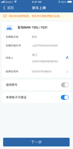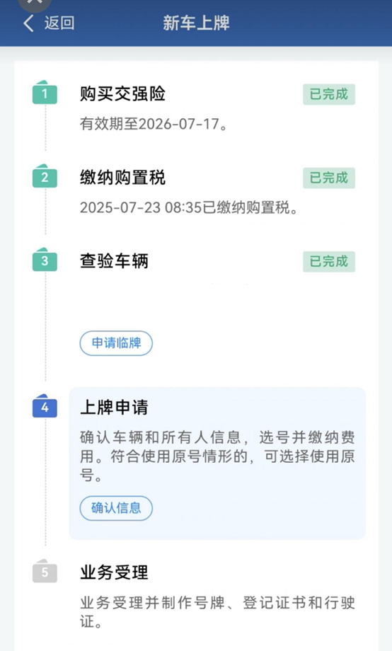 据悉,“云申领”模式从单一上牌功能,升级为新车选车、购险、完税、上牌,全流程“一站式”办理。“交管12123”APP新车上牌除身份认证外,无需上传其他材料,无需返单纸质材料。